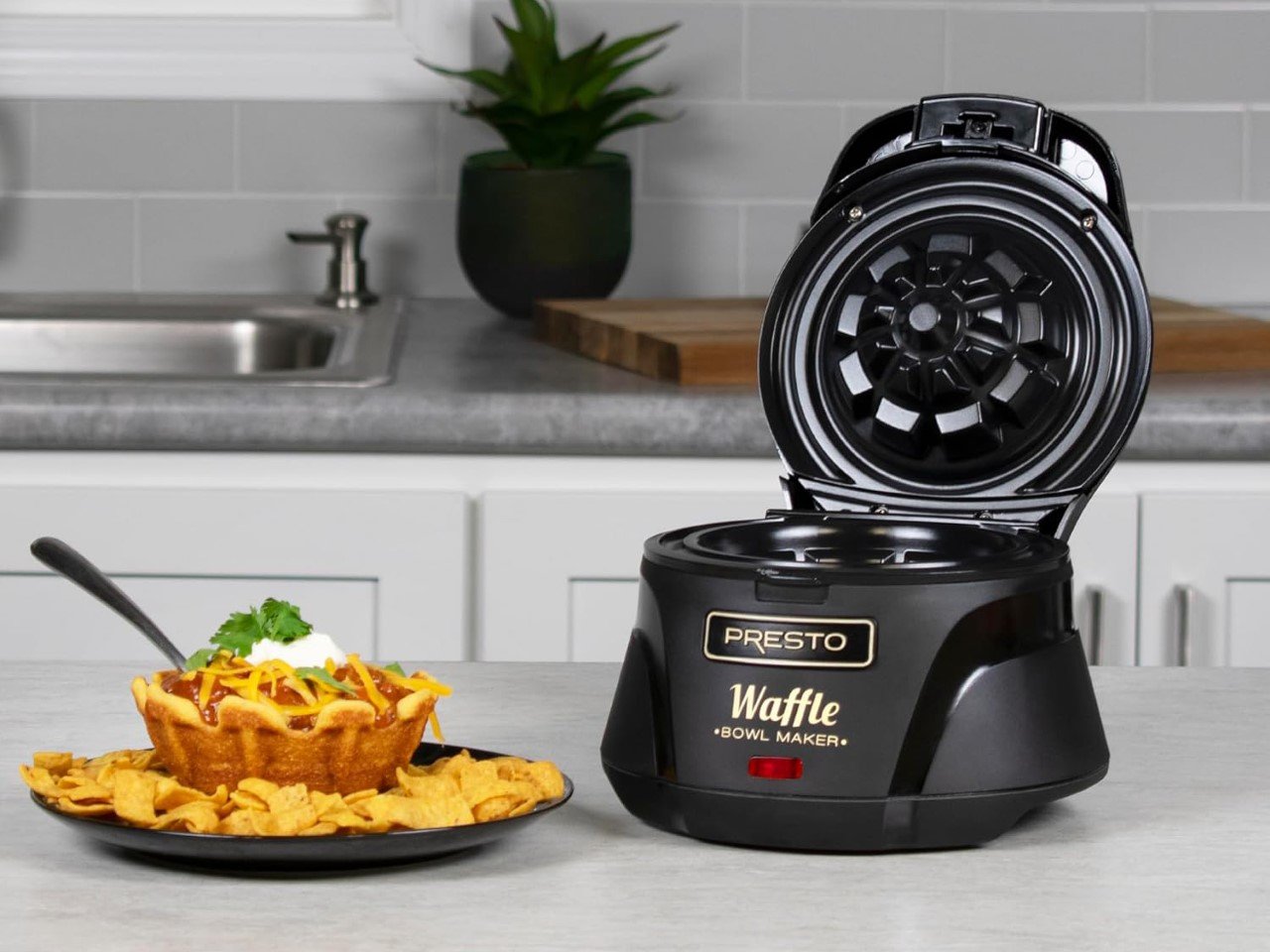 I legitimately gasped when I saw this appliance in my news feed. Yes, waffles are just pancakes optimized for better surface area and pockets to carry butter or syrup… but what if the waffle weren’t flat? What if it were bowl-shaped? Just imagine not having to precariously balance whipped cream and berries on top of a stack of waffles when you could just put the toppings INSIDE the waffle?
