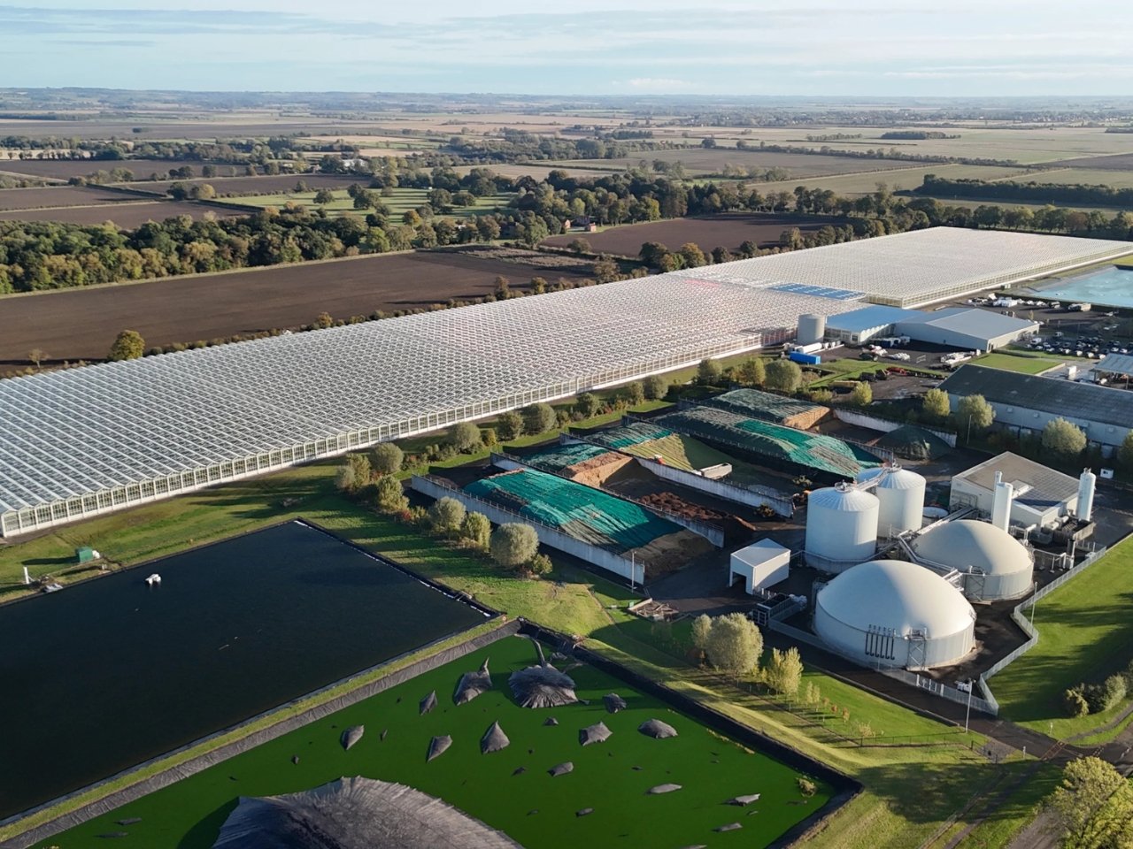 Dyson Farming’s glasshouse is as much about sustainability as it is about technology. Power comes from an onsite anaerobic digester, which breaks down grain to produce gas that runs turbines for electricity. The excess heat generated helps keep the glasshouse warm, and the leftover material from the digester, called digestate, is returned to nearby fields as organic fertilizer. Rainwater is captured from the massive 760-meter-long (about 2,500 feet) roof to hydrate the plants, and the facility relies mainly on natural sunlight, using minimal artificial light only when necessary.