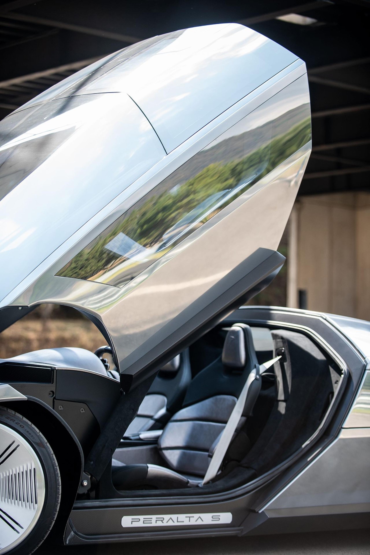 But you won’t find doors here. The Peralta S ditches convention by using a single, huge, front-hinged canopy that makes the MacBook Air’s clamshell opening look pedestrian. It lifts up like the cockpit of a fighter jet, making every entrance and exit an event while maintaining those clean lines that define the entire design philosophy. Even the windows do their own thing, swinging up gullwing-style so you can let the breeze in while looking like you stepped out of a sci-fi comic. The wheels are a modern nod to the old Boomerang’s alloys, slotted and sculpted, and the rear wing pops up automatically at speed, which is both a flex and a nod to the Countach crowd.